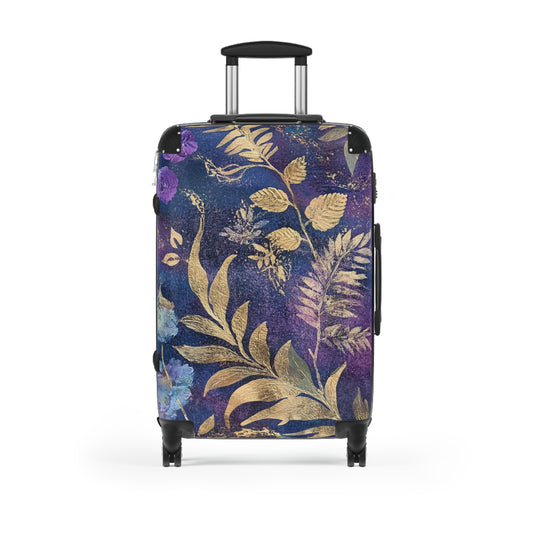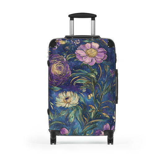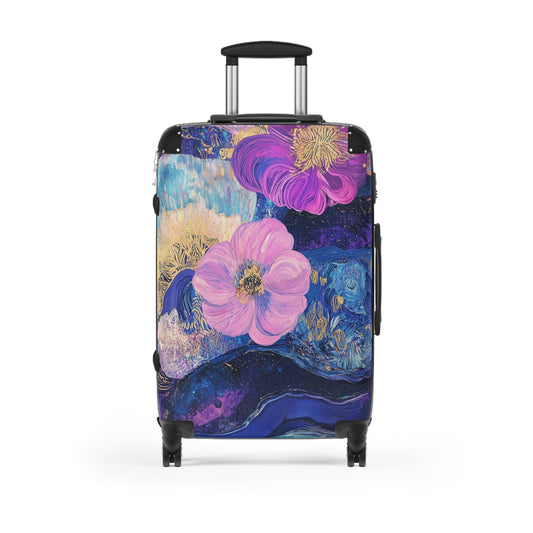 Tropical Floral Purple Suitcase, Bright and Colorful Designer Luggage for Airport, Rolling Weekender Travel Bag Gift for Flight Attendant